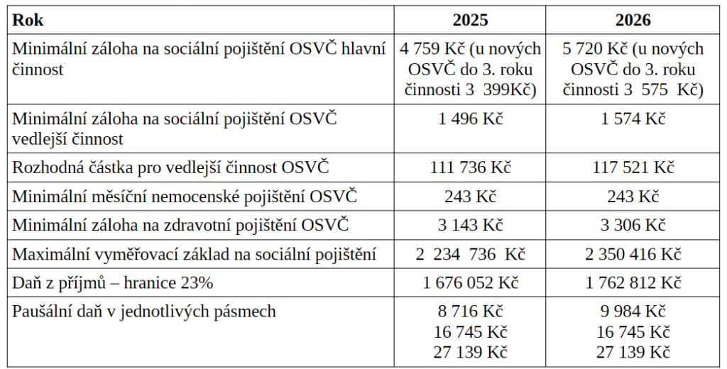 OSVČ – sociální od 1. 1. 2024 postupné zvedání kvůli penzijní reformě – v roce 2026 se dostáváme zatím na maximum (novou vládou přislíbeny změny, lze očekávat v průběhu roku 2026 vývoj v této oblasti):