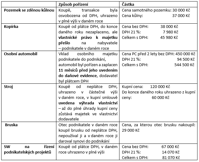 Podnikatel (neplátce DPH) s daňovou evidencí v daném roce koupil (dlouhodobý) hmotný a nehmotný majetek, jak uvádí následující obrázek.