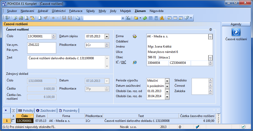 Co na to POHODA? Agenda Časové rozlišení eviduje souhrn časových rozlišení pro zdrojové doklady napříč jednotlivými agendami programu POHODA.