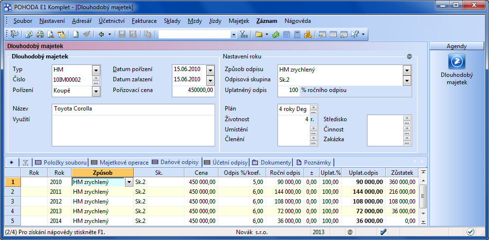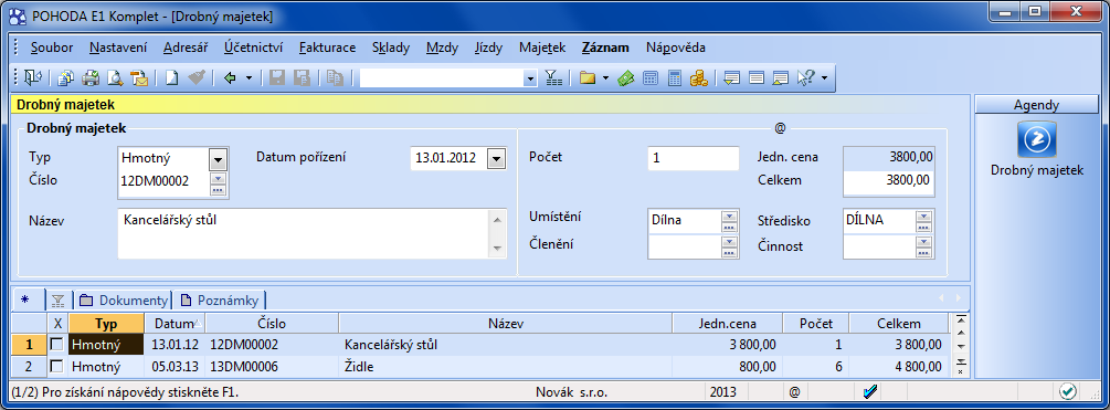 Co na to POHODA? Agenda Drobný majetek slouží jako evidence majetku, jehož pořízení se zaúčtovalo přímo do nákladů. Pro zápis dlouhodobého majetku slouží agenda Majetek.