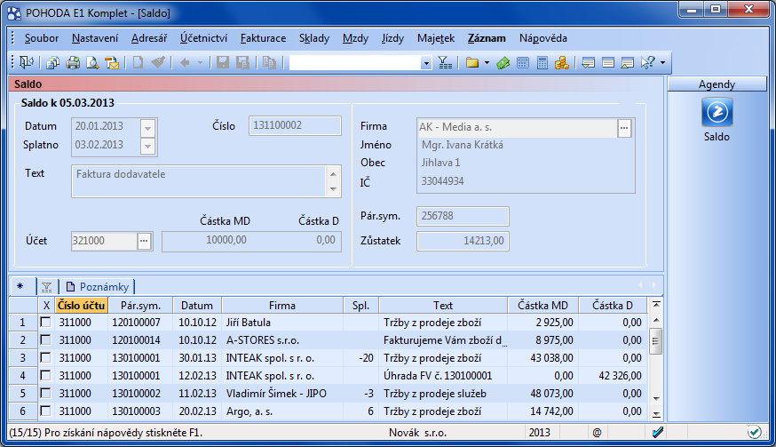 Co na to POHODA? V agendě Saldo lze sledovat vynulování částek strany MD a D uvnitř jednotlivých skupin spárovaných dokladů.