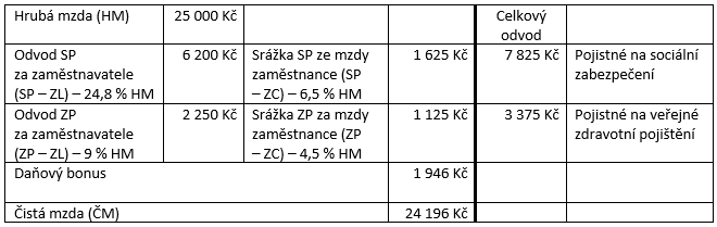Údaje v tabulce představují součtové hodnoty u jednotlivých položek za oba zaměstnance. V případě, že u některého zaměstnance vznikne nárok na daňový bonus, snižuje se o něj odvod záloh na daň ze závislé činnosti srážených z mezd ostatních zaměstnanců.