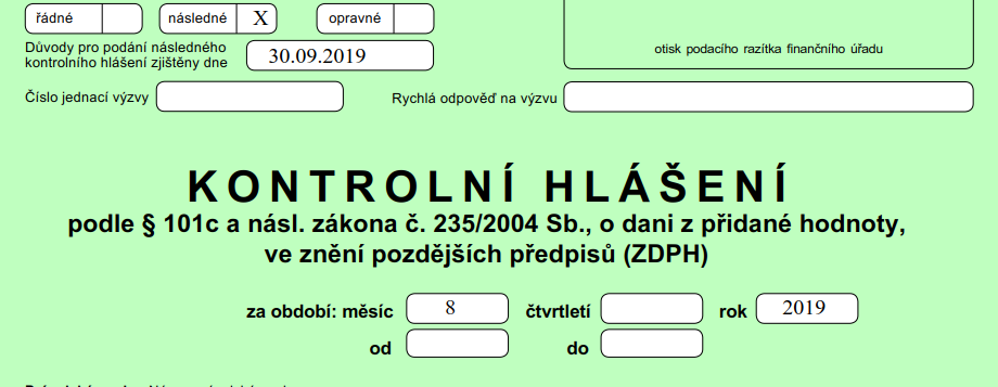 Pokud by plátce zjistil a opravil chybu do termínu pro podání řádného kontrolního hlášení, pak by podával opravné kontrolní hlášení. V našem případě však pan Kratochvíl zjistil chybu až 30. září 2019, proto musí podat následné kontrolní hlášení. Následné kontrolní hlášení se podává se všemi údaji z řádného kontrolního hlášení doplněné o rozdíl.