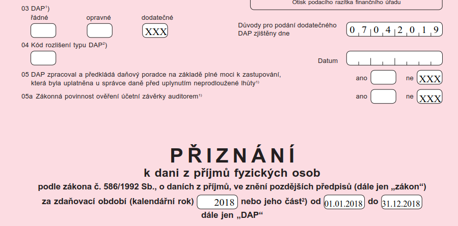 Pokud by pan Chládek nestihl podat opravné daňové přiznání do konce ledna 2019, pak lze podat již pouze dodatečné daňové přiznání. Dodatečné daňové přiznání se podává v případě poplatníkova zjištění jiné výše daně, než je jeho poslední známá daň. Je-li dodatečná daň nižší nebo beze změny poslední známé daně, je nutno důvody pro podání dodatečného přiznání blíže specifikovat ve sloupci 32 přiznání.