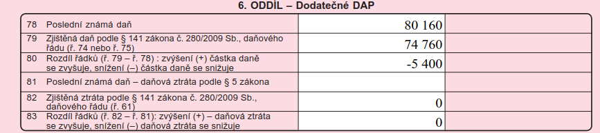 V tomto oddíle uvede poplatník poslední známou daňovou povinnost, která byla uvedena v řádném (či opravném) daňovém tvrzení, a zjištěnou daň z dodatečného daňového přiznání. Rozdíl nově tvrzené a původní daně bude mít v případě paní Novákové zápornou hodnotu, která vyjadřuje přeplatek, o který může poplatník prostřednictvím tohoto tiskopisu požádat.