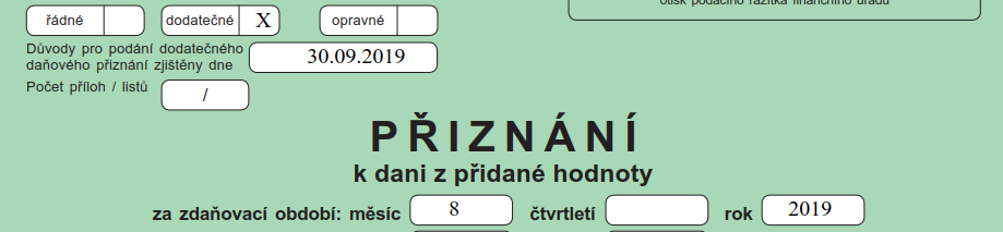 Pokud by po odeslání dodatečného daňového přiznání k dani z přidané hodnoty plátce opět zjistil chybu, pak do konce lhůty pro podání dodatečného daňového přiznání (v našem případě do 31. 10. 2019) podává opravné dodatečné daňové přiznání k DPH.