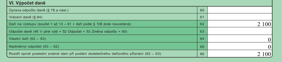 V dodatečném daňovém přiznání uvede pouze rozdíl mezi řádným a dodatečným daňovým přiznáním. V našem konkrétním případě tedy uvede na řádku 1 daňového přiznání základ daně 10 000 Kč a daň na výstupu 2 100 Kč. Pak až na řádku 62 uvede daň na výstupu 2 100 Kč a na řádku 66 uvede rozdíl oproti poslední známé dani opět ve výši 2 100 Kč.