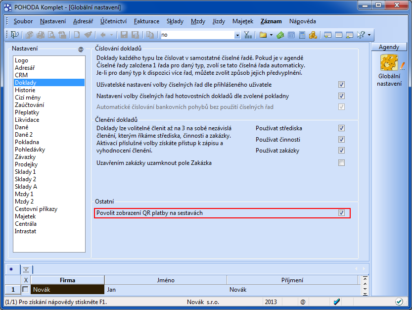 Co na to POHODA? V sekci Globální nastavení/Doklady je nová volba, která umožňuje zobrazení QR kódů na tiskových sestavách.