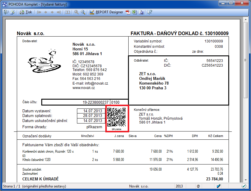 POHODA dále umožňuje také vlastní vytváření QR kódů. Pomůže vám s tím editor tiskových sestav Report Designer, který je součástí každé instalace systému POHODA. Vytvořený QR kód můžete přidávat na další tiskové sestavy.