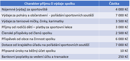 V daném kalendářním roce měl spolek následující příjmy a výdaje: