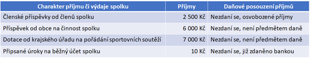 Zbylé příjmy spolku naplňují charakteristiky příjmů, které spolek nebude přiznávat ke zdanění daní z příjmů, neboť se jedná o příjmy od této daně osvobozené (členské příspěvky), příjmy mimo předmět daně (dotace a příspěvky z veřejných rozpočtů – obce, kraje) nebo příjmy již zdaněné plátcem příjmu (bankovní úroky).