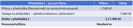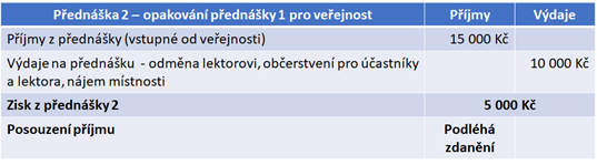 Příjmy zaplacené členy spolku za přednášku ve výši 1 500 Kč (tabulka 4) nebudou předmětem zdanění, neboť související výdaje jsou vyšší než tyto příjmy. O tyto výdaje nelze snižovat výsledný základ daně z příjmů, neboť souvisejí s příjmy, které zdanění nepodléhají. Výsledný základ daně z příjmů v tomto příkladu bude 5 000 Kč (zisk z přednášky 2).