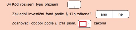 O jaké zdaňovací období se jedná, uvádíme v přiznání k dani z příjmů právnických osob v záhlaví (na úvodní straně) v odstavci 4 nazvaném „Kód rozlišení typu přiznání“. V části „Zdaňovací období podle § 21a písm.“ doplníme příslušné písmeno a), b), c) nebo d) ustanovení § 21a zákona o daních z příjmů.