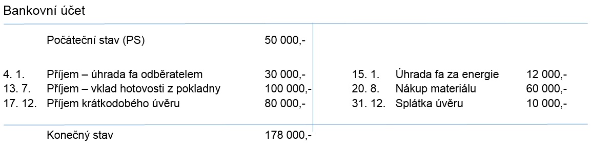 Konečný stav = PS 50 000 + obrat MD 210 000 − obrat D 82 000 = 178 000 Kč