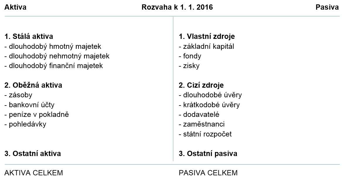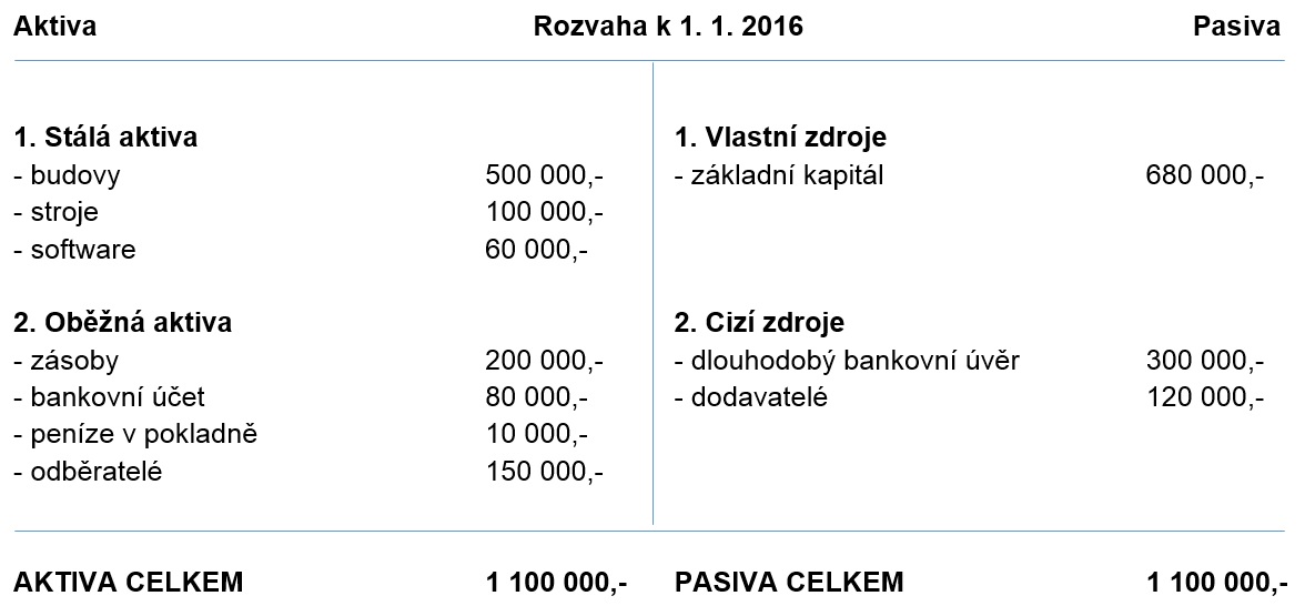 Účetní jednotka měla k 1. 1. 2016 následující stav majetku a zdrojů jeho krytí.