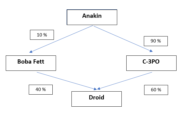 Situace je o něco složitější u společnosti Droid. Nepřímo vlastněný podíl spočítáme jako součin všech podílů, které vedou od mateřské společnosti (Anakin) ke společnosti, v níž podíl chceme zjistit (Droid). Z výše uvedeného plyne, že společnost Droid je také součástí konsolidačního celku (nepřímý podíl překročí 20 %).