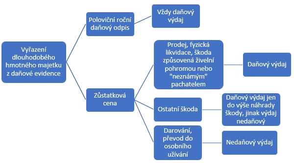 Zatímco správně stanovený poloviční roční daňový odpis je vždy výdajem daňovým bez ohledu na důvod vyřazení z obchodního majetku, pro daňové posouzení zůstatkové ceny je důvod vyřazení rozhodující, jak ukazuje následující schéma: