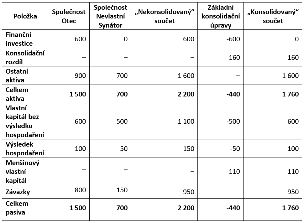 - spočítáme konsolidační rozdíl podle výše uvedeného vzorce – kupní cena (tj. 600) ponížená o procentní podíl společnosti Otec na čistých aktivech společnosti Nevlastní Synátor (tj. 80 % z 550), celkem tedy 160,