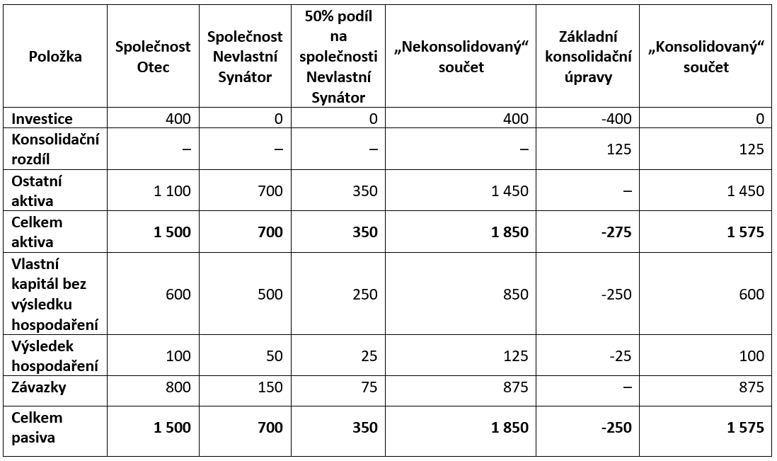 - Konsolidační rozdíl = Kupní cena 50% podílu (tj. 400) − (vlastní kapitál společnosti Nevlastní Synátor (tj. 550) × výše podílu ve společnosti Nevlastní Synátor, tj. 50 %).