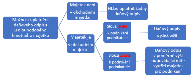 U daňového odpisování dlouhodobého hmotného majetku platí obdobný režim, jako jsme uváděli výše u oprav tohoto majetku. Proto následuje i obdobné schéma pro rozhodnutí o možnosti uplatnění daňového odpisu: