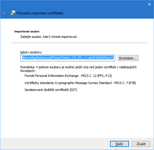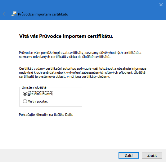 Na základě žádosti vygenerovaný certifikát je nutné nainstalovat přímo do vašeho počítače (zařízení), ze kterého chcete tržby evidovat. Vyberete soubor certifikátu a dvojklikem myši spustíte Průvodce importem certifikátu. Umístění úložiště zvolíte Aktuální uživatel: