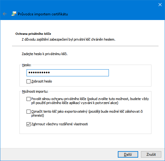 V případě, že používáte operační systém Windows XP, Windows Vista nebo starší verze Windows Server (Windows Server 2008 a starší), nainstalujte certifikát s volbou Označit tento klíč jako exportovatelný. Pokud volbu nezatrhnete, nebude fungovat komunikace programu POHODA se serverem EET. Zárověň u těchto operačních systémů nebude fungovat komunikace v případě, že používáte Proxy server. V tom případě lze doporučit použít např. Forefront TMG Client.