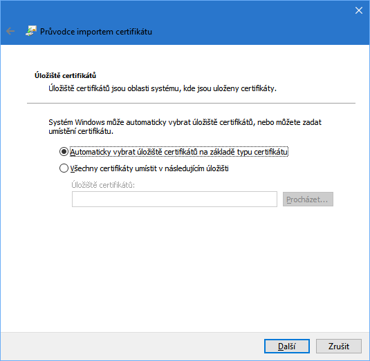 V průvodci ponecháte vybrané úložiště certifikátu na volbě Automaticky vybrat úložiště certifikátů na základě typu certifikátu a ukončete průvodce tlačítkem DalšíDokončit.