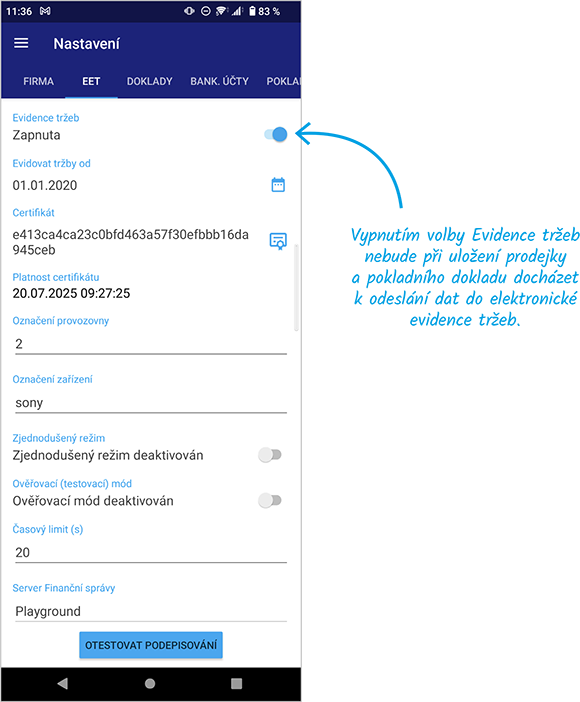 Pro ukončení elektronické evidence tržeb vypněte danou volbu na mobilním zařízení s nainstalovanou aplikací mPOHODA či mKasa, a to na záložce EET v agendě Nastavení.