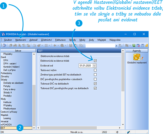 EET, která začala fungovat v roce 2016, tak skončí bez náhrady. Máme pro vás návod, jak EET funkce ručně vypnout v programu POHODA, a také doporučení, proč začít nejdříve u aplikací mPOHODA či mKasa, pokud některou z nich používáte.