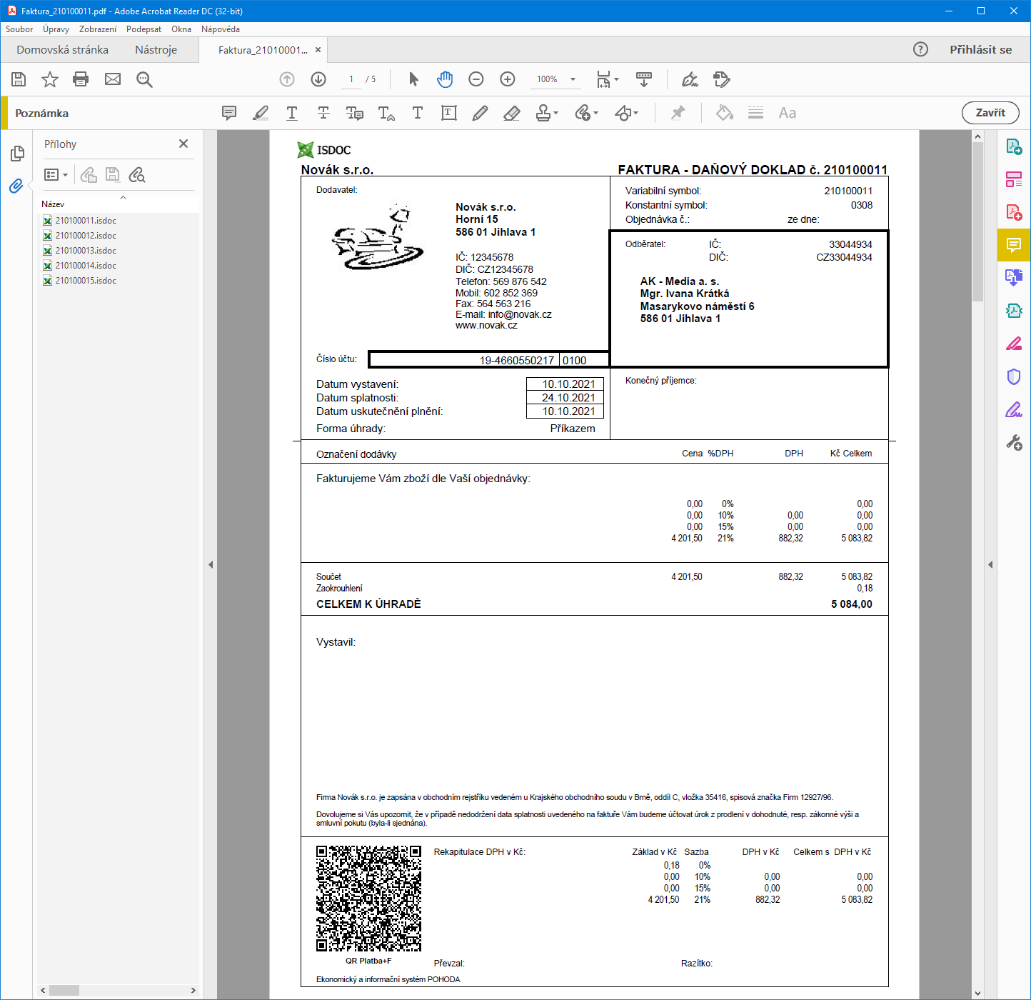 Další možností je i export ISDOC dokumentu přímo do přílohy PDF. Díky tomu je můžete odeslat zákazníkovi najednou, a ušetřit tím čas i riziko případné chyby při odeslání.