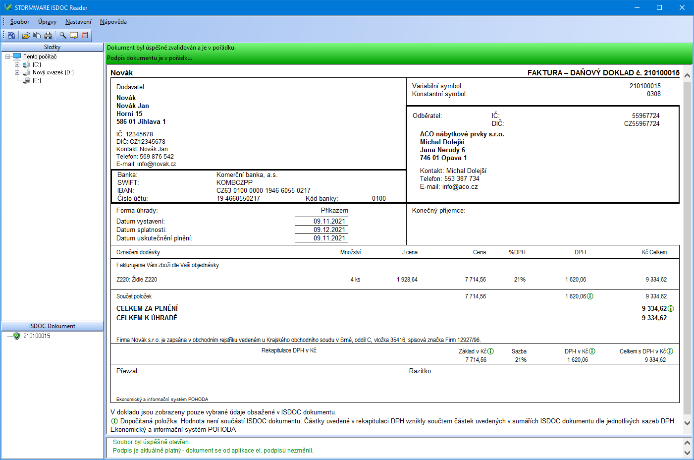 Přijaté doklady ve formátu ISDOC můžete otevřít v programu STORMWARE ISDOC Reader, stačí pouze dvakrát poklepat na soubor. Otevřený ISDOC dokument naimportujete do programu POHODA prostřednictvím povelu Soubor/Import do ES POHODA. Další možností, jak doklady importovat, je načtení přímo v programu POHODA, a to prostřednictvím povelu Import z ISDOC… z nabídky Soubor/Datová komunikace, či import z PDF dokumentu, který obsahuje ISDOC jako přílohu.