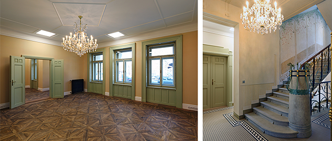 Hlavní prostory domu se nachází ve druhém nadzemním podlaží, kde vzniklo šest místností se samostatným sociálním zařízením a moderně koncipovanou čajovou kuchyňkou. Celkem čtyři budoucí kanceláře najdete také ve vstupním patře a další tři neobvyklé prostory nabízí suterén s krásně klenutými stropy a netradičním osvětlením. Vše je propracované do detailů, některá zdobená skla či mosazné kličky v oknech se dokonce dochovaly z dob Rakouska-Uherska.