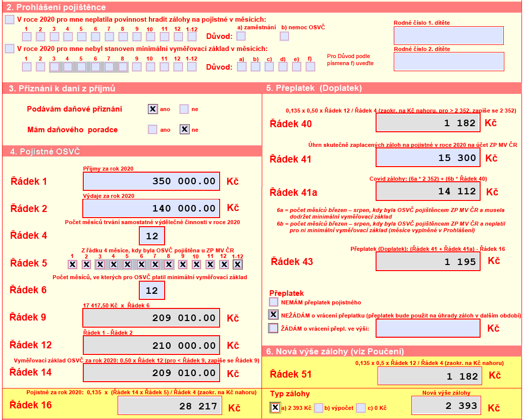Oproti minulým rokům se formuláře přehledů pro zdravotní pojišťovny trochu liší, přibyla v nich totiž nová pole. A to kvůli tomu, že v loňském roce bylo OSVČ odpuštěno zdravotní pojištění až do výše minimálních záloh za měsíce březen až srpen.