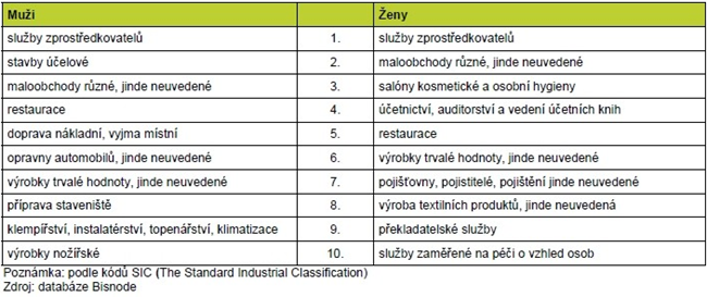 Živnostenská oprávnění jsou v Česku nejčastěji vydávána v oblasti zprostředkování a obchodu. Muži – živnostníci dále nejčastěji podnikají v oblasti stavebnictví, provozu restaurací, dopravy a opraven automobilů.