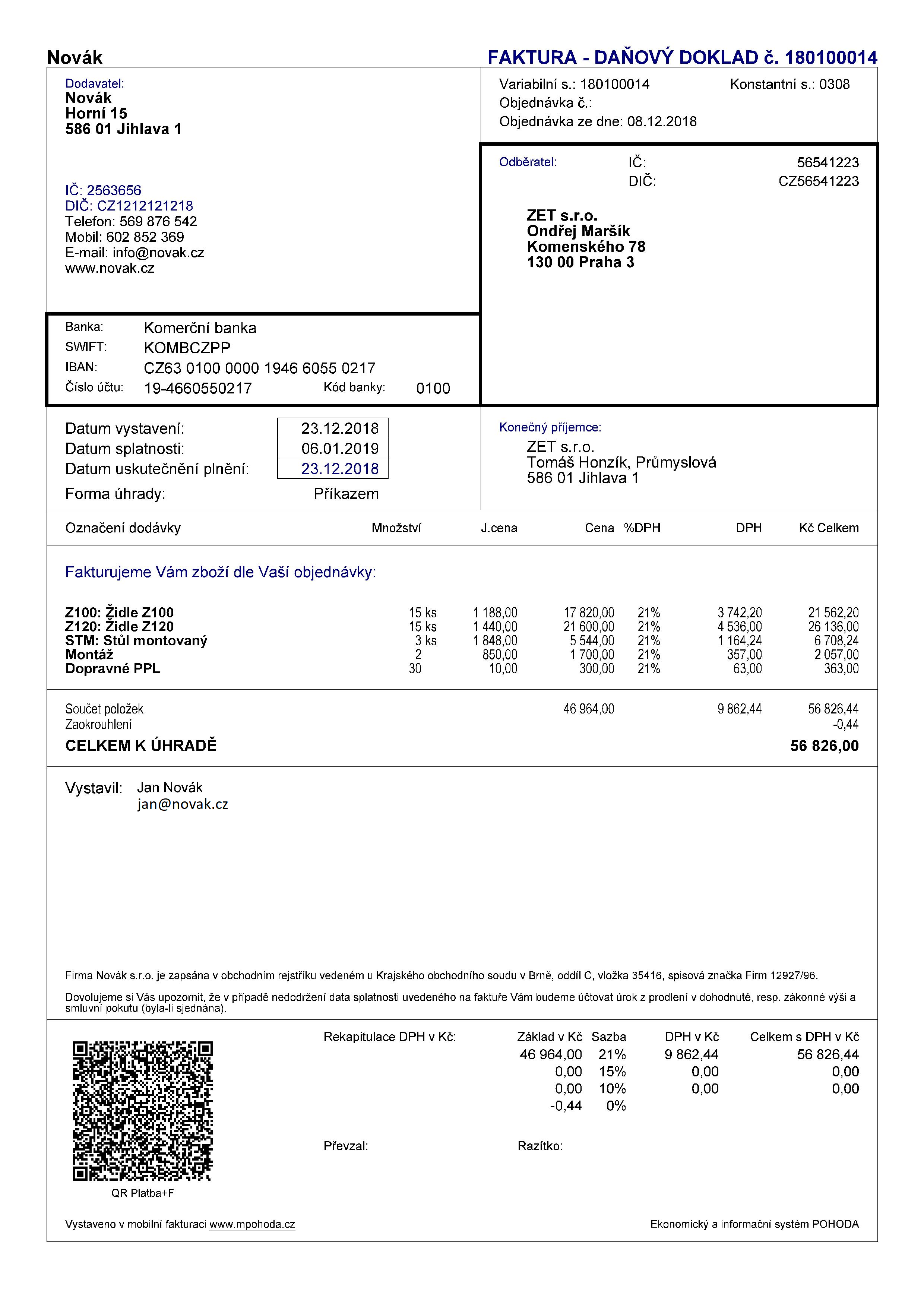 Pokud má vaše faktura formu úhrady příkazem na bankovní účet, rozšíří se QR kód o platební údaje na formát QR Platba + F, ve kterém jsou jak údaje o faktuře, tak i platební údaje. Jen prosím zkontrolujte, že váš účet máte uložený i ve formátu IBAN. Klasický „český” formát QR kód nepodporuje.