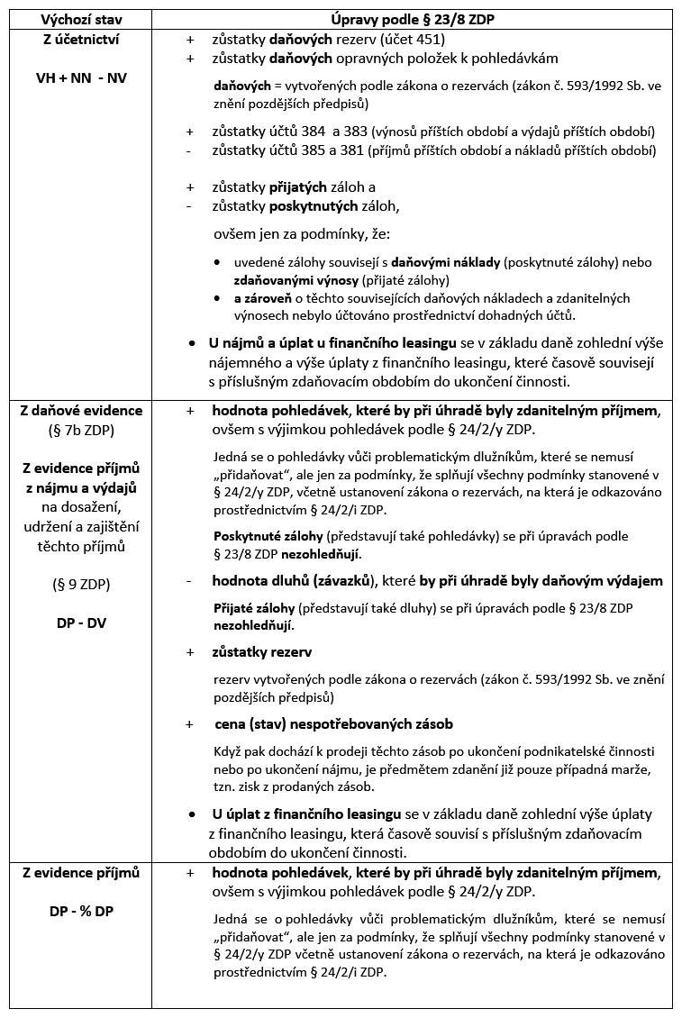 Potřebné úpravy podle § 23 odst. 8 ZDP pro jednotlivé kategorie fyzických osob – poplatníků daně z příjmů uvádí následující tabulka. Zůstatky, hodnoty či ceny uvedené v tabulce vycházejí ze stavu ke dni ukončení činnosti.
