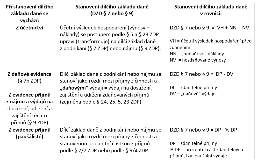 Činnost zdaňovaná podle § 7 ZDP je širší než jen vlastní podnikání tak, jak jej definuje občanské právo (§ 420 občanského zákoníku). Proto pokud v tomto článku zmiňujeme podnikání či podnikatele, platí to stejné i pro fyzické osoby, jejichž činnost není podle občanského práva podnikáním, ale mají povinnost zdaňovat své příjmy podle § 7 ZDP (příjmy ze samostatné činnosti), viz následující schéma: