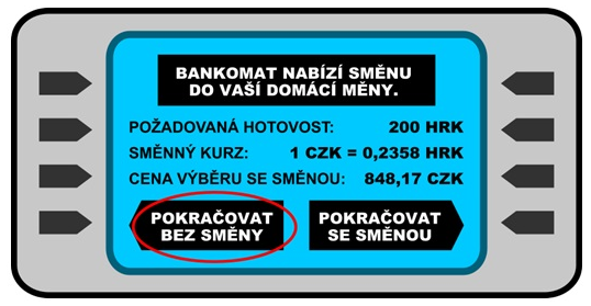 V případě platby nebo výběru z bankomatu v zahraničí je tak z pohledu zákazníka většinou lepší nechat si transakci vyúčtovat v místní měně a využití služby DSS, kterou nabízí terminál, odmítnout.
