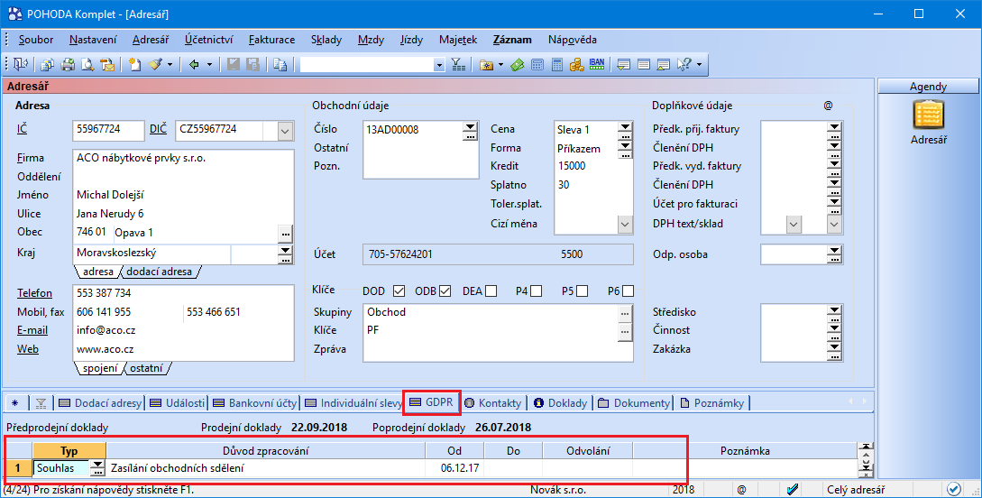 V každodenním pracovním shonu je přehledný adresář obchodních kontaktů nepostradatelný pomocník. Této zásady se držíme stále, a tak správu osobních údajů dle nařízení GDPR začleňujeme právě do Agendy Adresář.