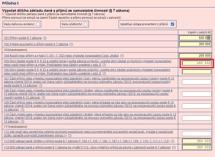 Z výše uvedených pohledávek není třeba dodaňovat pouze pohledávku 5 000 Kč za dlužníkem, který zemřel. Všechny ostatní je potřeba zdanit, tj. 100 000 + 20 000 + 30 000 = 150 000 Kč. Částku 150 000 Kč pan Novák uvede v dodatečném přiznání za rok 2020 v Příloze č. 1 do tabulky E jako položku zvyšující základ daně a dále do ř. 105. K dodaňovaným pohledávkám nelze uplatňovat paušální výdaje – nejde o příjem, ale o úpravu základu daně. Daň z pohledávek 150 000 Kč + 15 % = 22 500 Kč.