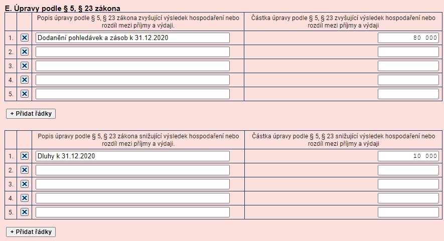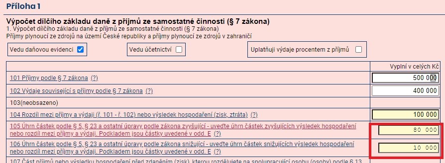 Pan Nový zvýší v Příloze č. 1 v tabulce E a na ř. 105 základ daně o pohledávky 50 000 Kč a zásoby 30 000 Kč, tj. celkem 80 000 Kč. Naopak sníží základ daně v tabulce E a na ř. 106 o hodnotu závazků (dluhů) 10 000 Kč. Zaplacené ani přijaté zálohy v přiznání zohledňovat nebude.