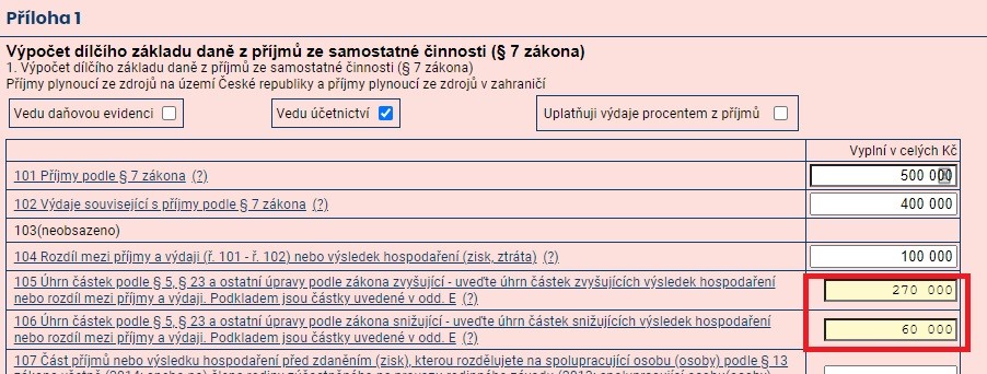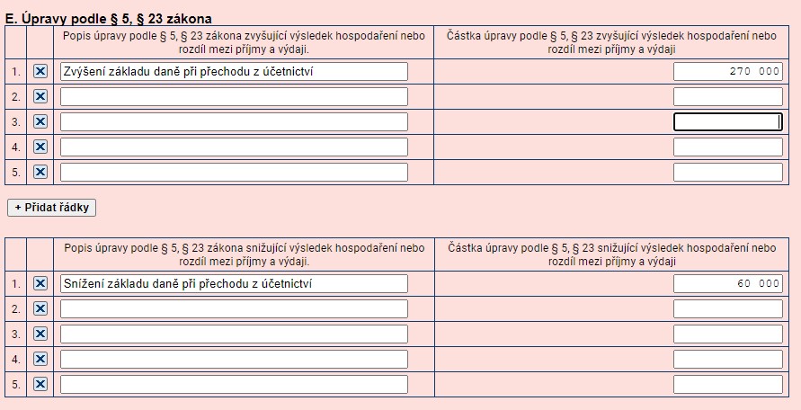 Pan Beránek zvýší v Příloze č. 1 v tabulce E a na ř. 105 základ daně o opravné položky 100 000 Kč, o přijatou zálohu 120 000 Kč a výnosy příštích období 50 000 Kč, tj. celkem o 270 000 Kč. Naopak sníží základ daně v tabulce E a na ř. 106 o zaplacené zálohy 50 000 Kč a náklady příštích období 10 000 Kč, tj. celkem 60 000 Kč.