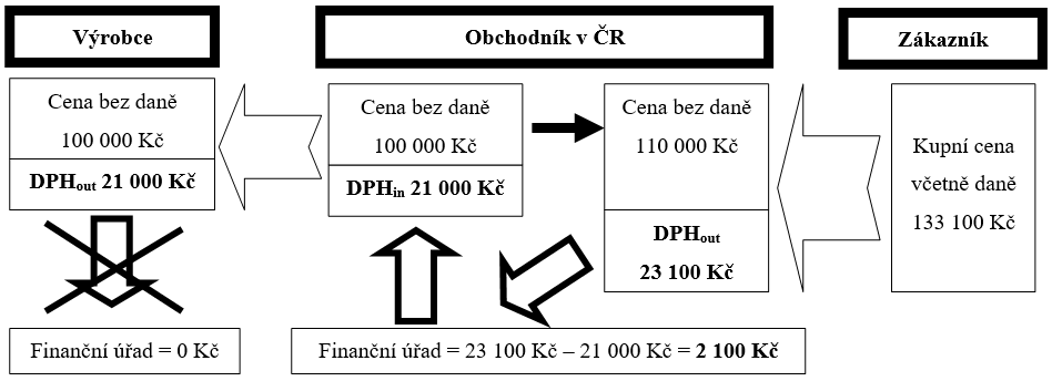 Výrobce prodá zboží obchodníkovi (oba plátci) za 100 000 Kč + DPH 21 000 Kč, kterou ale nepřizná nebo neodvede. Obchodník si tuto DPH nárokuje k odpočtu a prodá zboží jako plnění osvobozené od české DPH s nárokem na odpočet DPH na vstupu – například vývoz z EU nebo prodej firmě z jiného státu EU. Proto nebude prodejní cena 110 000 Kč zatížená DPH výstupu. ČR tímto přišla o 21 000 Kč vyplacených obchodníkovi.