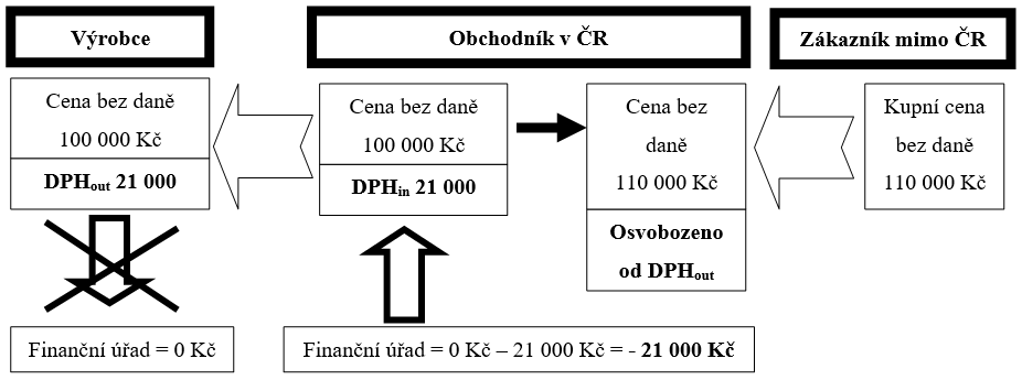 Ještě tristnější je situace – v praxi typická pro podvody na DPH – kdy obchodník zboží vyveze mimo EU (např. prodá na Ukrajinu) nebo dodá firmě z jiného státu EU (pročež podléhá DPH ve státě pořízení zboží). Pak jde totiž o prodej osvobozený od české DPH na výstupu, a to při zachování nároku na odpočet DPH na vstupu.