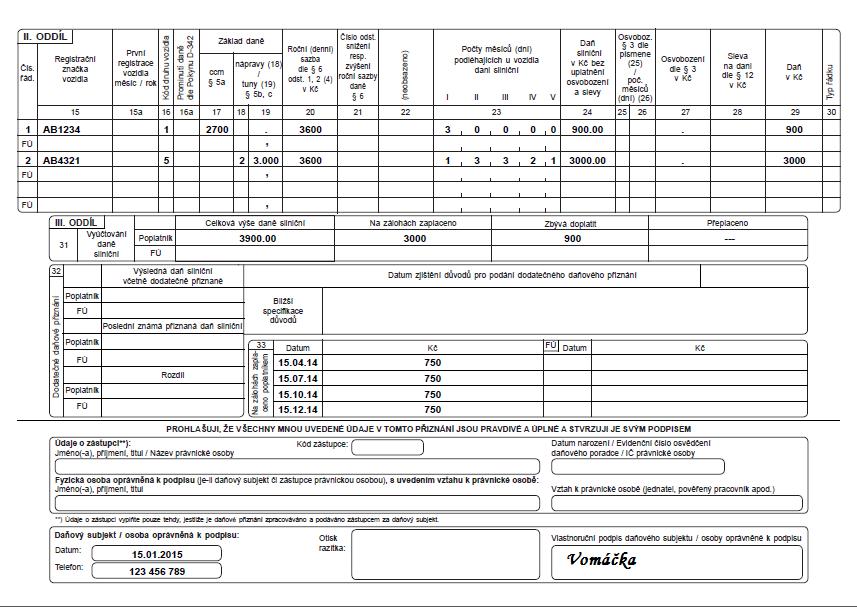 Automobil č. 2 je nákladní vůz, má poznávací značku AB4321, první registrace je 15. 8. 2002 a toto vozidlo si pan Vomáčka pořídil v březnu 2014. Pan Vomáčka zaplatil v roce 2014 na zálohách za obě vozidla dohromady 3 000 Kč. Jak bude postupovat při vyplnění přiznání k silniční dani za rok 2014?