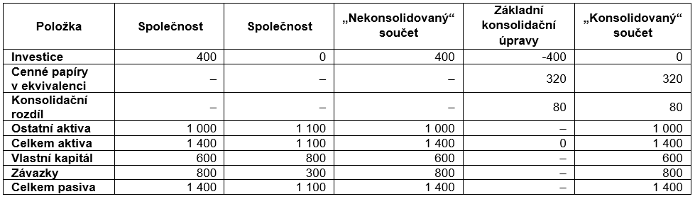 V našem příkladu nám tedy vyjde hodnota konsolidačního rozdílu 80, tj. 400 − (800 × 40 %).