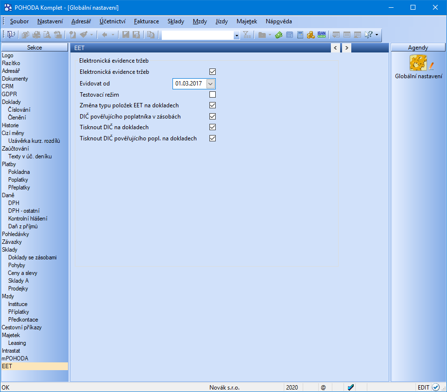 Aby byly agendy programu POHODA a veškerá nastavení týkající se elektronické evidence tržeb přístupné, je nutné v agendě Globální nastavení v sekci EET zatrhnout volbu Elektronická evidence tržeb.