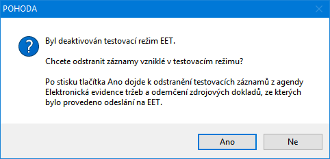 Při přechodu z testovacího režimu do produkčního, tedy do režimu s možností evidovat už skutečné tržby, je třeba volbu Testovací režim deaktivovat. V takovém případě vás program POHODA vyzve, zda chcete z agendy Elektronická evidence tržeb odstranit záznamy, které byly odeslané v testovacím režimu.