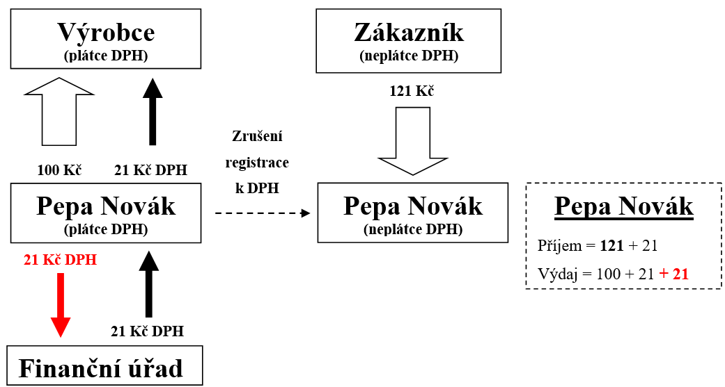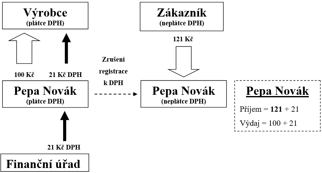 V důsledku totiž za zboží zaplatil 121 Kč. Výrobci uhradil 100 Kč a také „jeho“ DPH 21 Kč, kterou mu nejprve finanční úřad „vrátil“ formou odpočtu daně, ale pak kvůli zrušení registrace musel tento odpočet daně 21 Kč úřadu „vrátit“. A od zákazníka obdržel rovněž 121 Kč, z nichž OSVČ již coby neplátce neodvádí DPH.