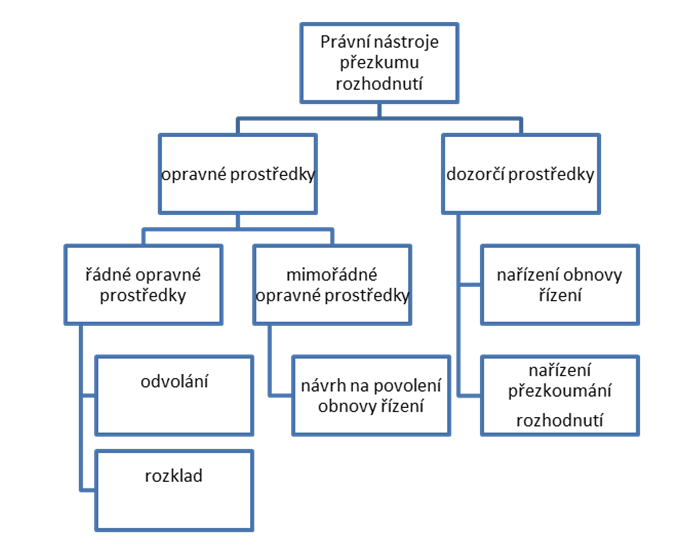 Nejprve několik obecných informací o systematickém zařazení jednotlivých institutů. Opravné a dozorčí prostředky upravuje zákon daňový řád (dále jen „DŘ“) ve své sedmé hlavě. Jak se tyto právní nástroje dělí, můžete vidět na následujícím grafu.